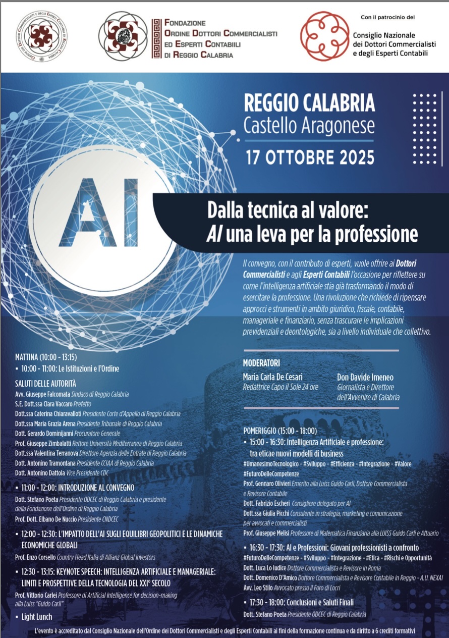 IL CONVEGNO CON IL CONTRIBUTO DI ESPERTI VUOLE OFFRIRE AI DOTTORI COMMERCIALISTI E AGLI ESPERTI CONTABILI L’OCCASIONE PER RIFLETTERE SU COME L’INTELLIGENZA ARTIFICIALE STIA GIA’ TRASFORMANDO IL MONDO DI ESERCITARE LA PROFESSIONE.
